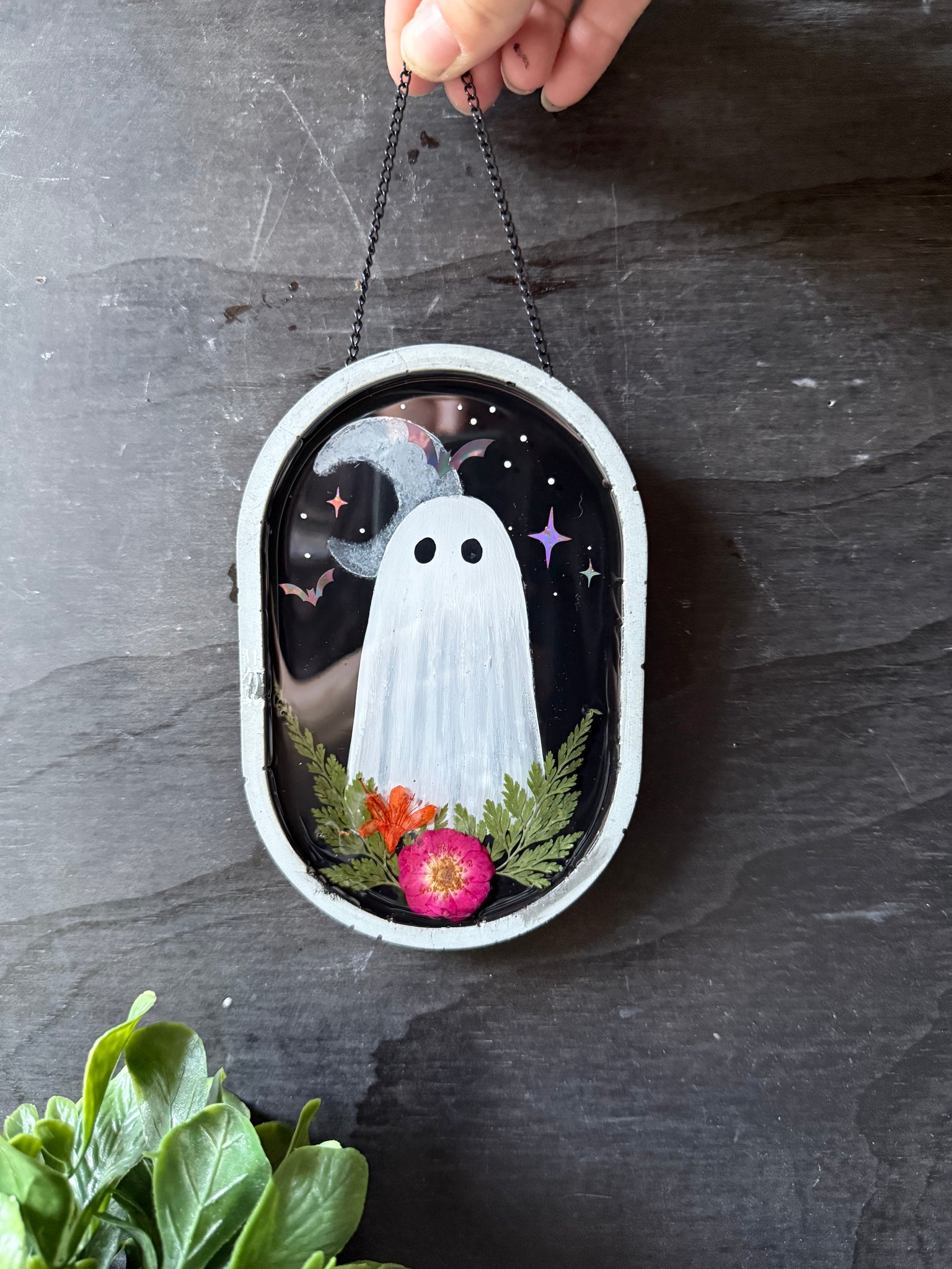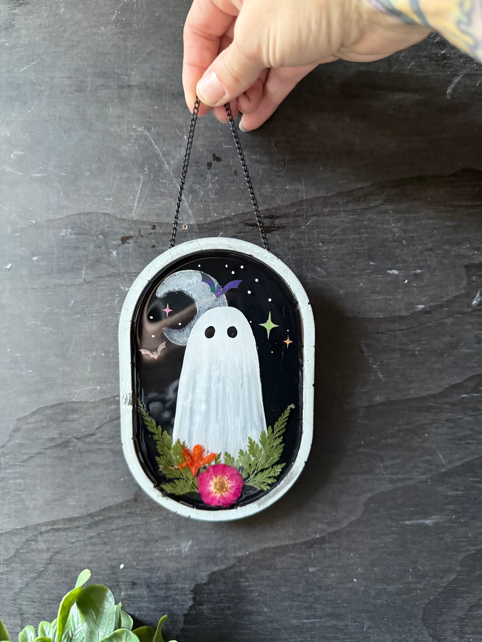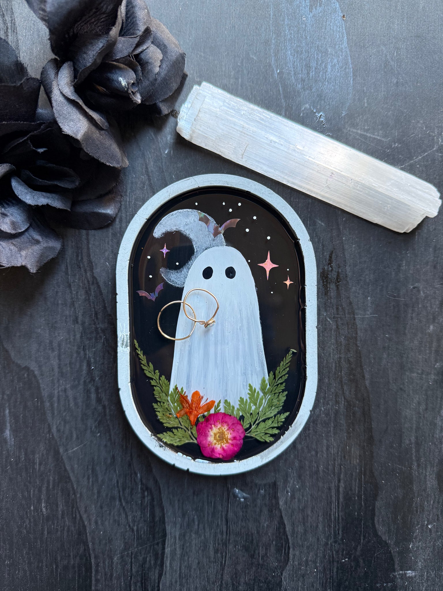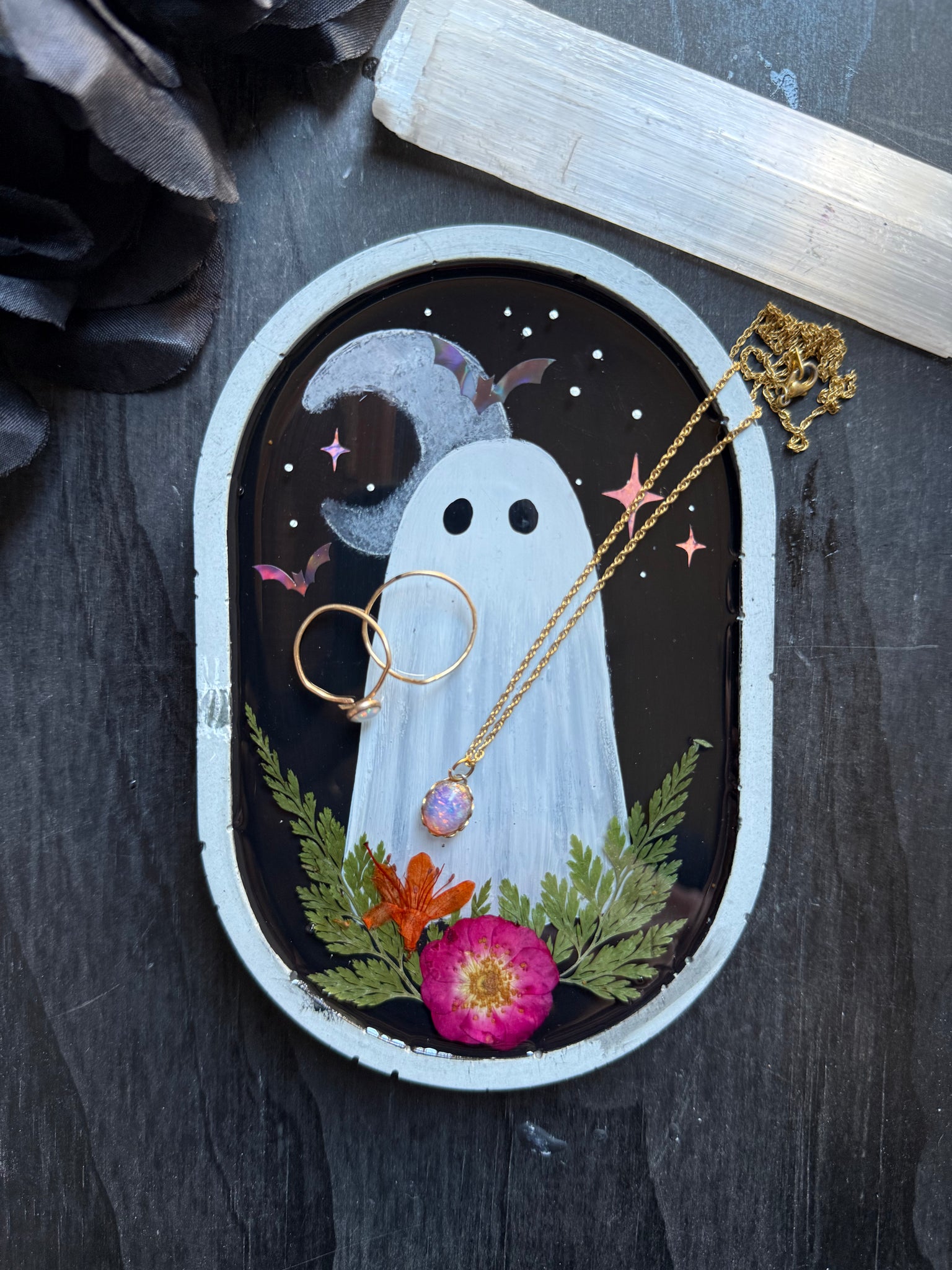 Add a touch of spooky whimsy to your space with the Boo-tanical Magic Tray, featuring a hand-painted ghost under a glowing moon, surrounded by real pressed flowers and fern leaves. Perfect for lovers of witchy, cozy, and Halloween-inspired decor.