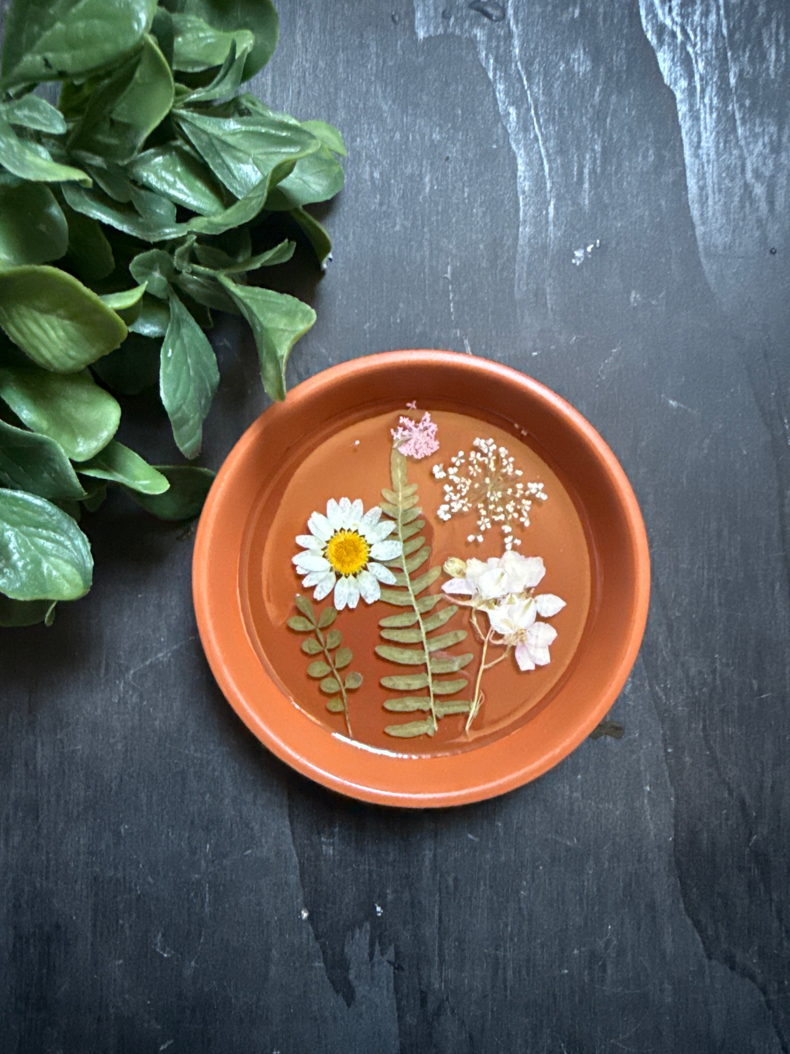 -Added dried flowers and greenery are layered with resin for a durable glass like finish.