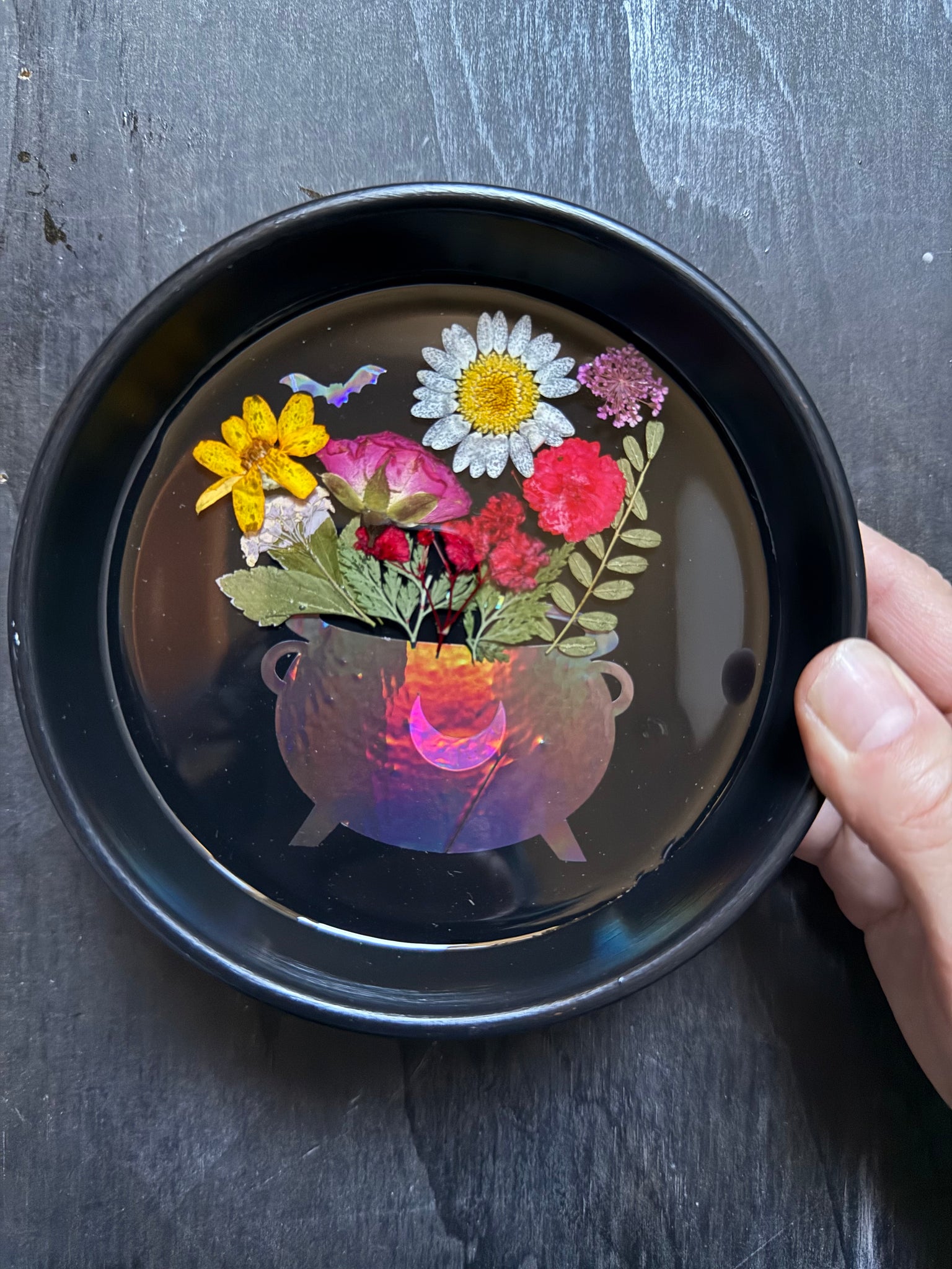 - Cauldron is cut from a holographic vinyl and has a bouquet of dried greenery and florals