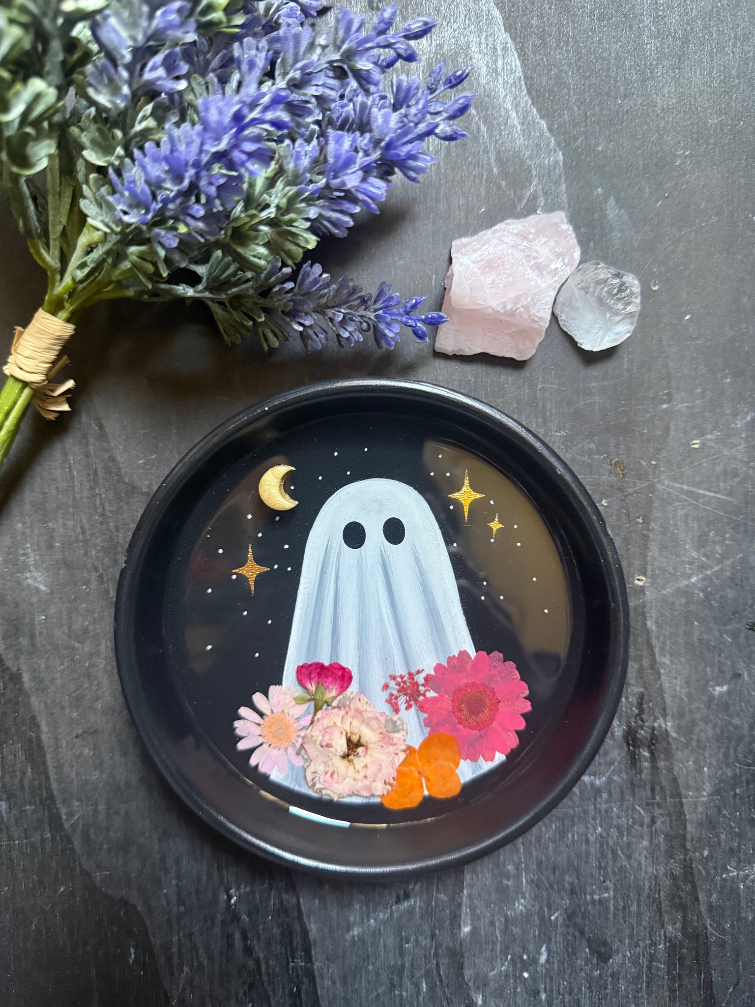 At the center is my Ghoul in Bloom tray, a handmade piece featuring a sweet ghost surrounded by florals which is perfect for holding jewelry, crystals, or simply displaying as decor. Paired with a matching eco-resin ghost figurine, this set adds a whimsical, spooky touch to any altar, vanity, or cozy corner of your home.