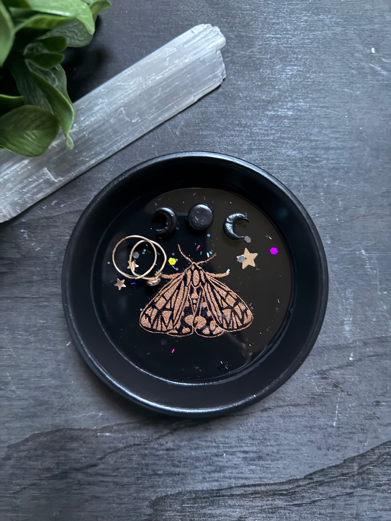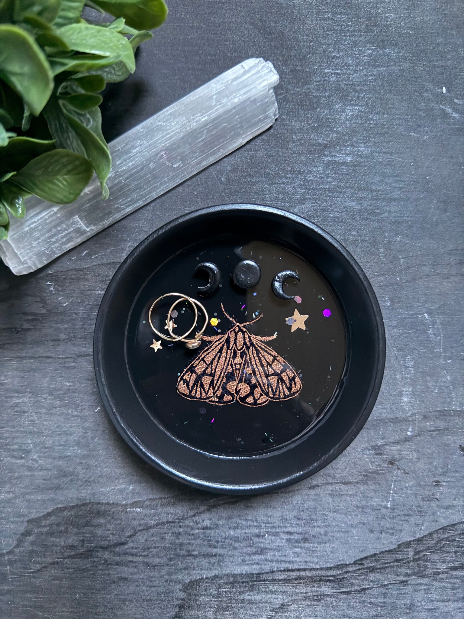The Moonlit Moth Tray is handcrafted for those who live by intuition, honor the moon’s phases, and love their decor with a little shadow and shimmer. This round tray features a hand-painted black center layered with a bronze fabric-cut moth — symbolizing transformation and feminine power — surrounded by a delicate clay moon phase and subtle holographic glitter for a magical sparkle.