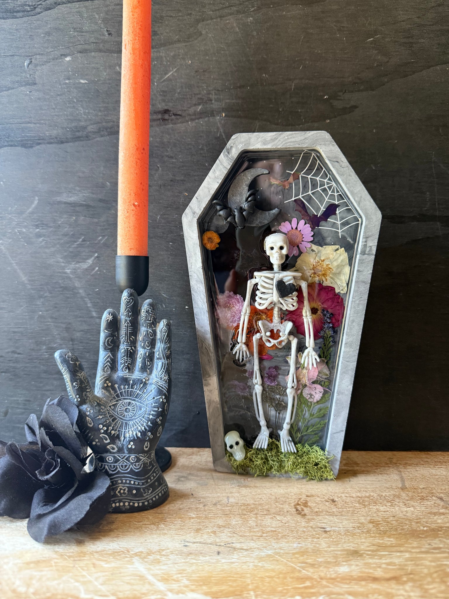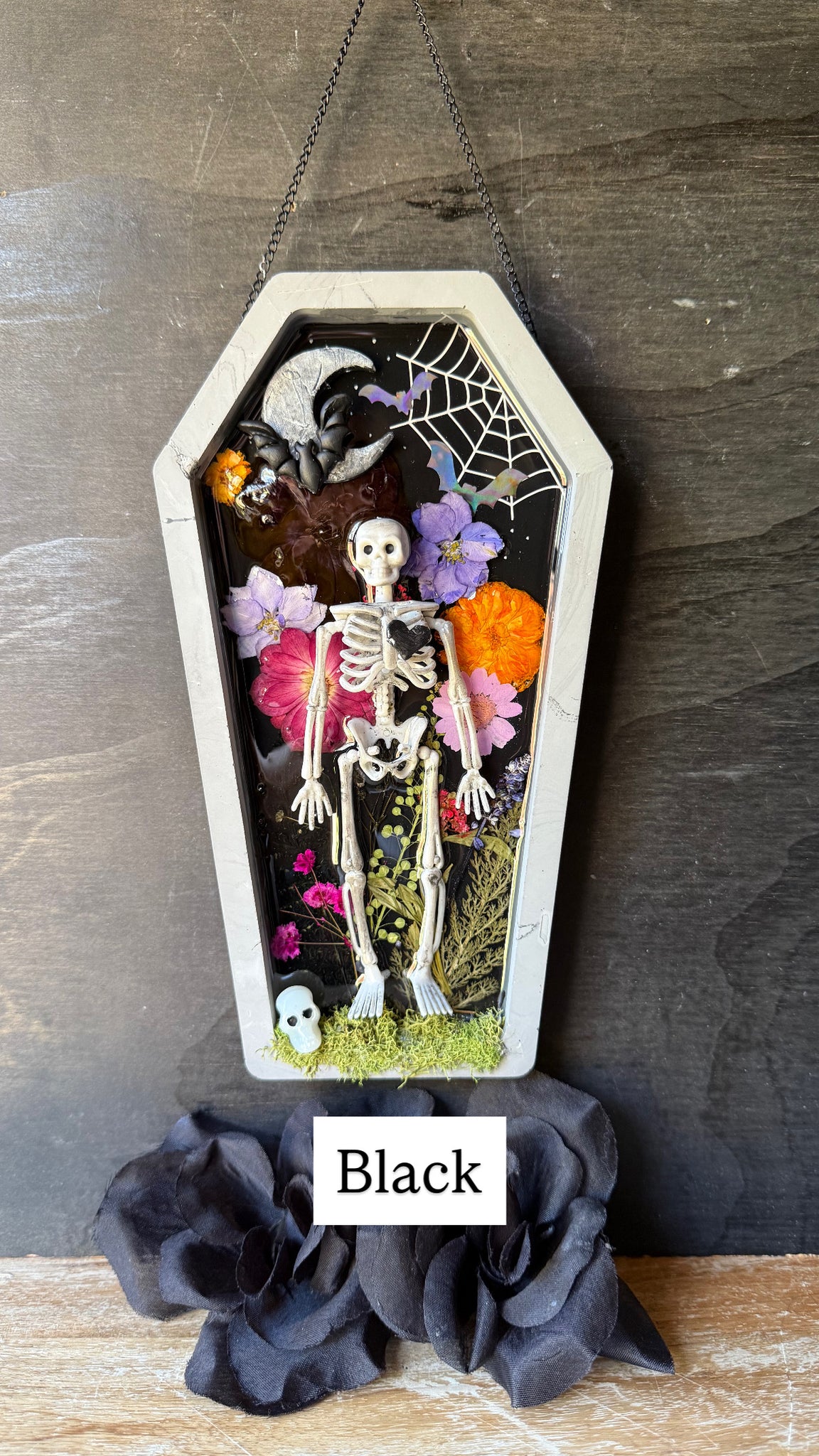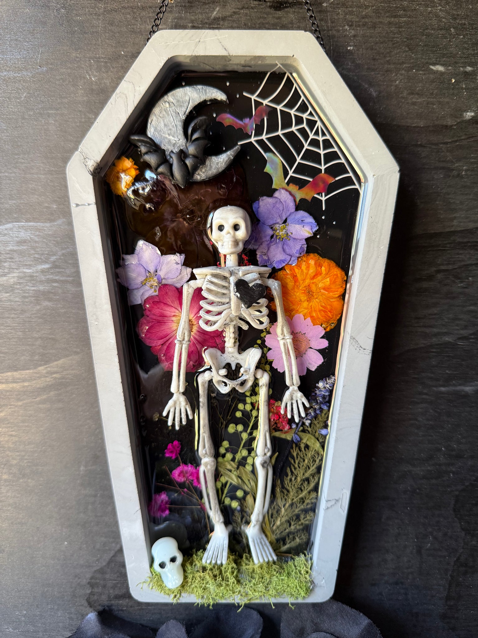 This one-of-a-kind piece features a delicate skeleton spirit resting within a coffin-shaped frame, surrounded by pressed wildflowers, moss, and celestial accents. A crescent moon, fluttering bat, and spiderweb weave together the perfect balance of spooky and whimsical — making this the ultimate statement piece for lovers of witchy décor, dark cottagecore, and all things enchanted.