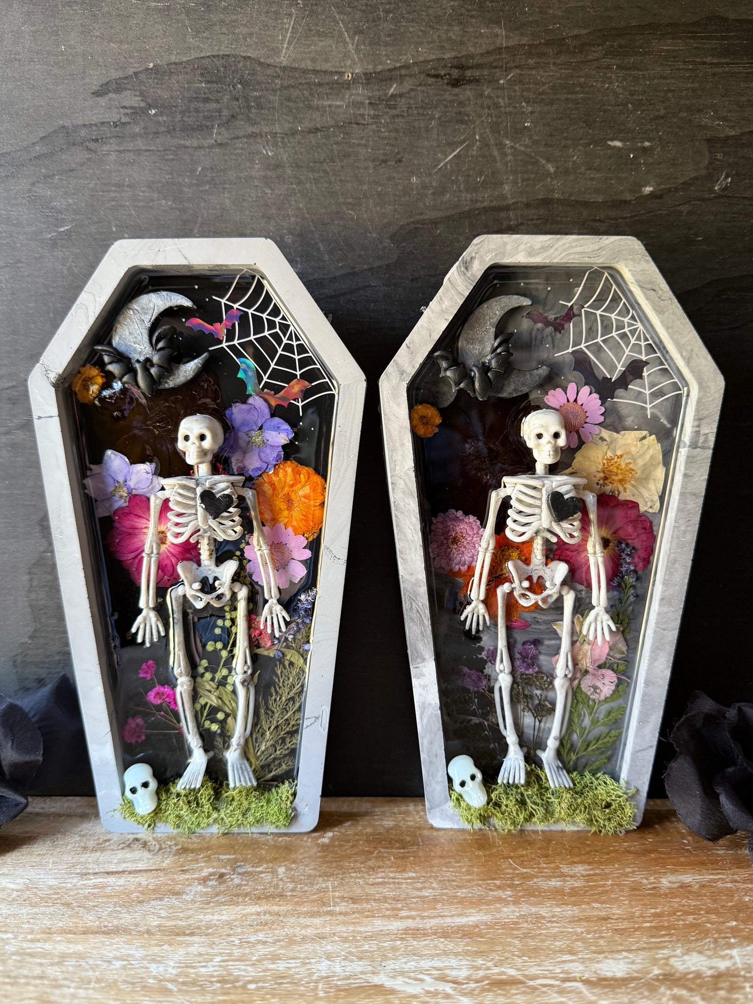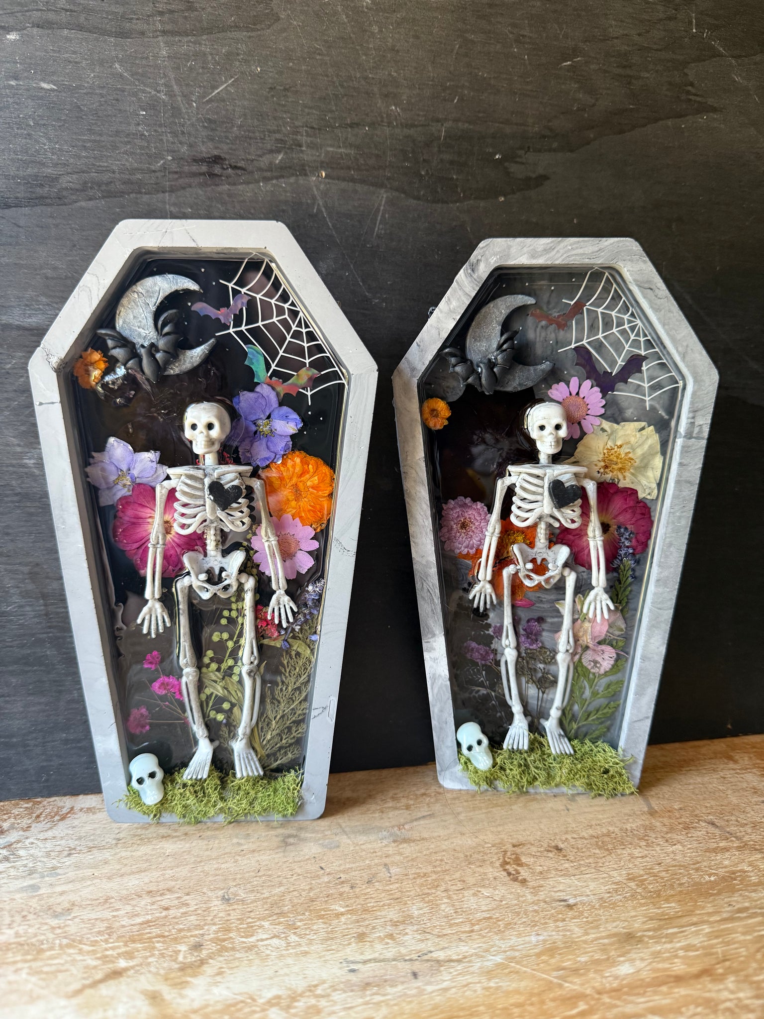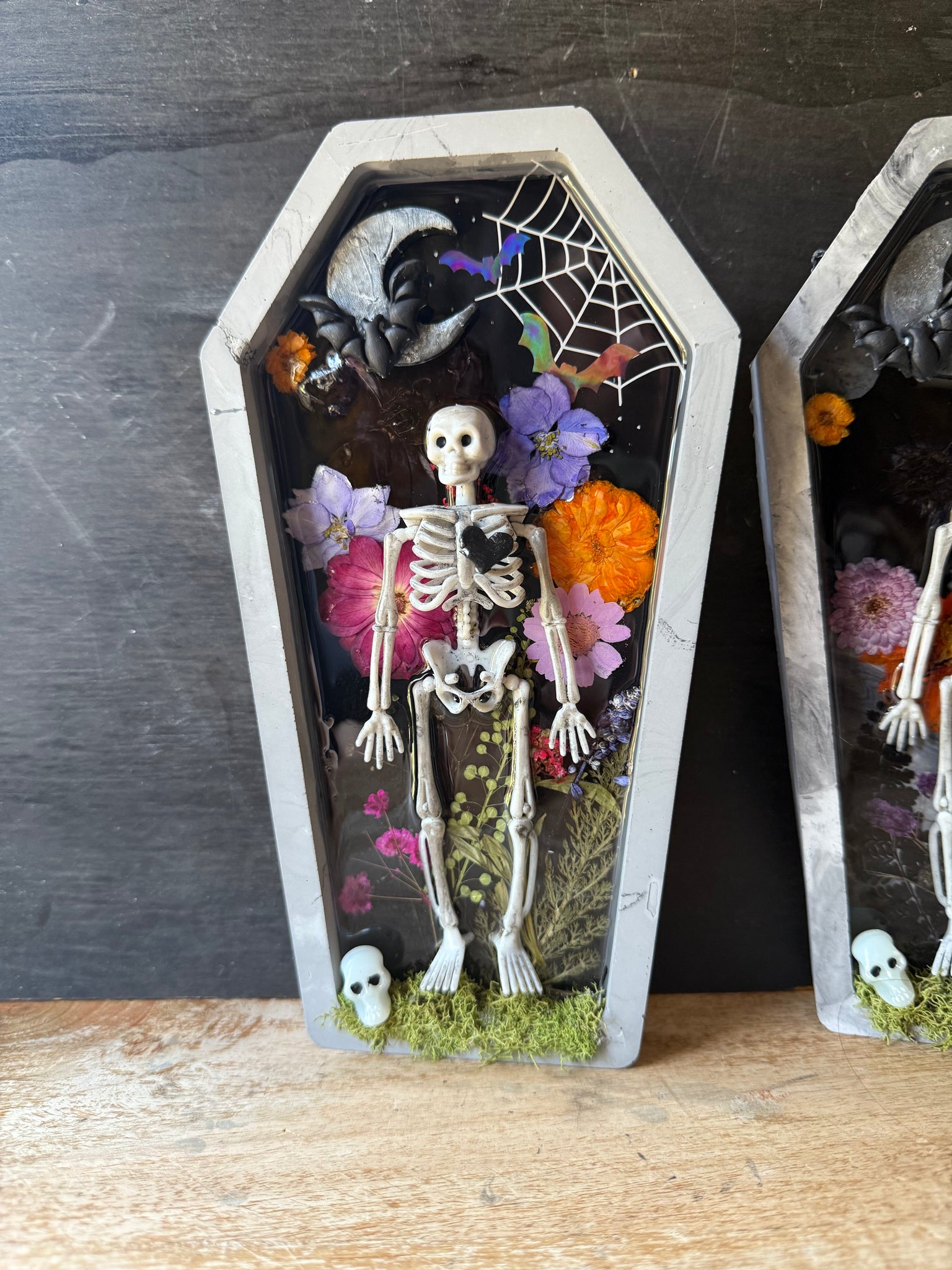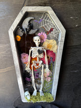 This one-of-a-kind piece features a delicate skeleton spirit resting within a coffin-shaped frame, surrounded by pressed wildflowers, moss, and celestial accents. A crescent moon, fluttering bat, and spiderweb weave together the perfect balance of spooky and whimsical — making this the ultimate statement piece for lovers of witchy décor, dark cottagecore, and all things enchanted.