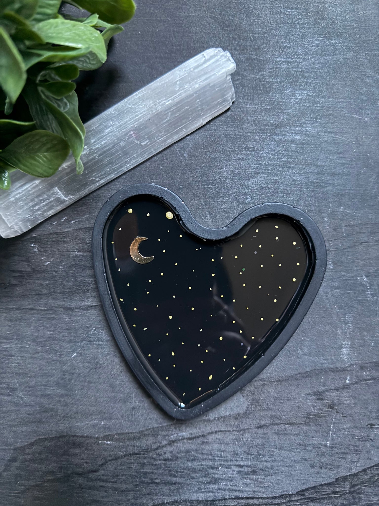 The Starlit Heart Tray is handcrafted for the ones who wish on the moon, decorate with intention, and believe in making their space feel sacred and a little sparkly. This heart-shaped tray features a hand-painted black base with golden stars and a crescent moon.